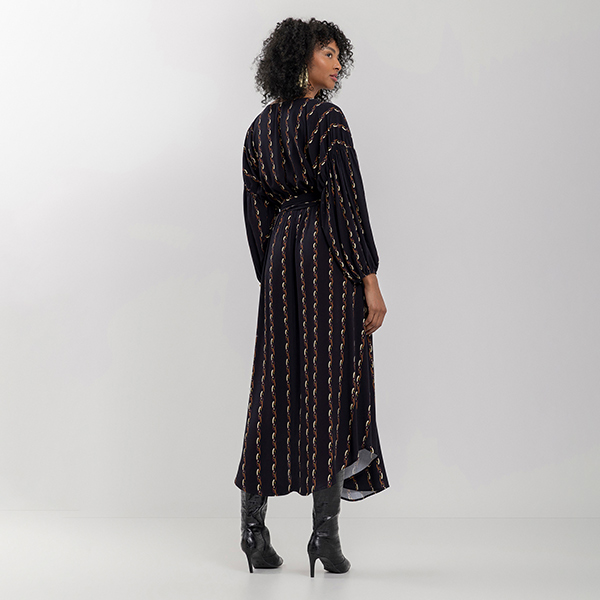 Vestido Bali Chain Preto tiene estampado de cadenas, confeccionado en viscosa ligera de caída fluida. Tiene mangas largas y amplias con puños elásticos, cintura marcada con cinturón del mismo tejido y un movimiento precioso al caminar. Un vestido elegante, cómodo y muy favorecedor.