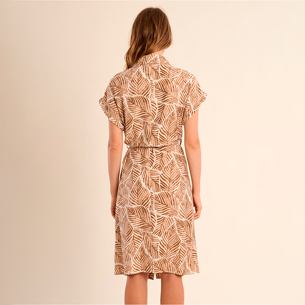 El Vestido Camel Mathil es un camisero fluido con estampado tropical, manga corta y lazada en la cintura. Cómodo, fresco y con un toque elegante para el día a día ✨