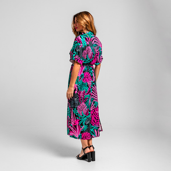 El Vestido Camisero Midi Nocturna largo con cierre delantero, manga corta y cuello de solapa.  Además un detalle que nos encanta, bolsillos en su cadera y dos cortes en los laterales lo que hace que sea muy cómodo y fácil de llevar. Además con su cinturón podrás ajustártelo a tu gusto.