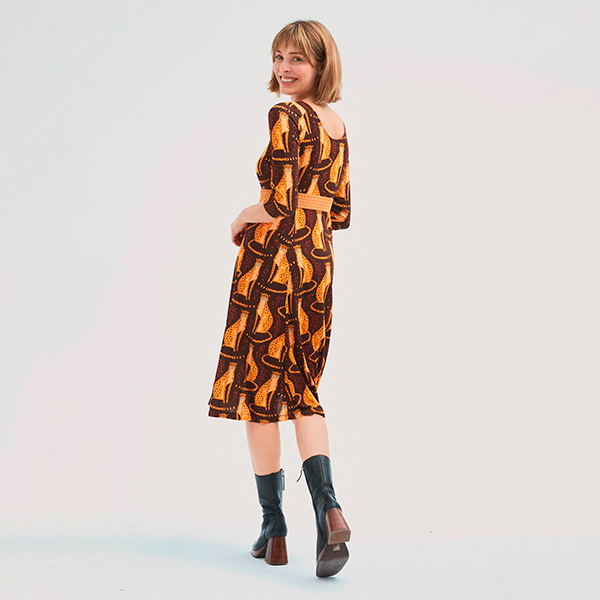 Este vestido de largo midi, en tejido elástico y manga francesa. Cuello redondo abierto, corte debajo del pecho. Y que decir de su estampado llenito de panteras en color mostaza sobre fondo marrón. En un tejido muy dulce al tacto que queda pegadito a tu cuerpo, como una segunda piel. Está hecho 95% de viscosa 5% elastane.