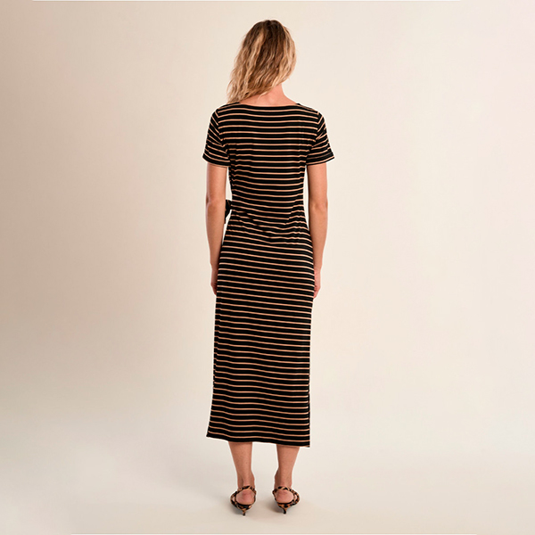 El estampado de rayas en contraste alarga visualmente la figura, reforzando ese efecto estilizador que hace que siente tan bien.