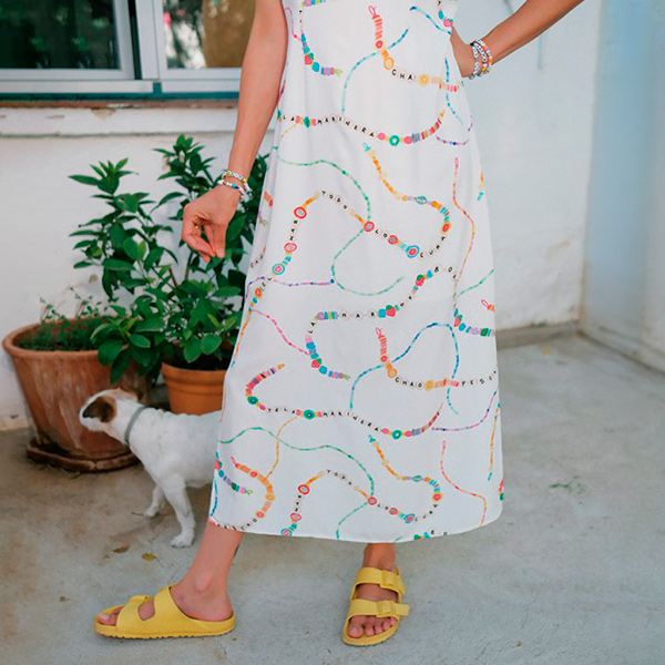 El Vestido Largo Pulseras es de viscosa con tirantes ajustables, escote en V y abertura lateral. Estampado colorido inspirado en pulseras noventeras con mensajes que le dan todo el carácter. Fresco, cómodo y con rollazo.