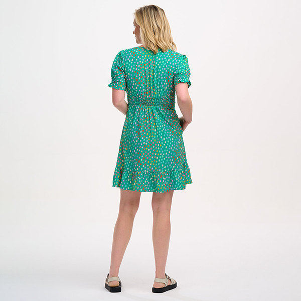 Este vestido tiene uno de nuestros estampados más icónicos. Vestido básico con un corte vintage, abotonados en el delantero con detalle de volantes en el bajo y manga corta abullonada.Es de algodón orgánico: suave, transpirable y perfecto para el uso diario. ¡No querrás quitártelo!