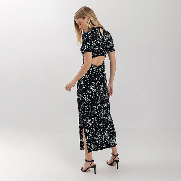 A primera vista parece sencillo, pero el verdadero “wow” llega por detrás: una abertura en la espalda que sorprende, deja piel a la vista y eleva el look sin perder comodidad. Las mangas cortas y la gola alta equilibran el diseño, creando una pieza elegante, moderna y muy fácil de llevar.