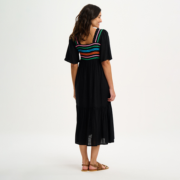 El Vestido Selene Black es uno de los preciosos diseños de Sugarhill una de nuestras marcas FAVS que fabrica ropa producida de manera ética y sostenible. Sus estampados son ÚNICOS. Dibujados a mano están digitalizados por su propio equipo de diseño. Llevan desde 2006 creando ropa que te encantará usar una y otra vez porque sus prendas nunca pasan de moda.