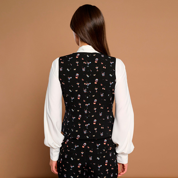 El Zia Vest con cierre delantero abotonado y de corte entallado te va a encantar.Cuello en pico y manga a la Sisa. Estampado de coctel que te va a encantar perfecto para combinar con los prendas de la colección.